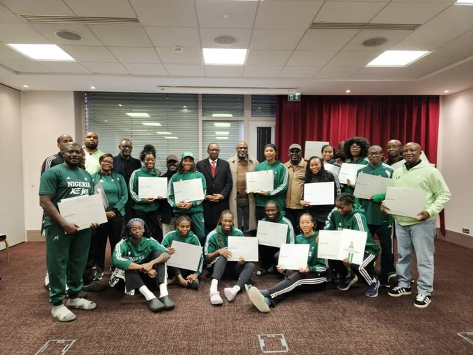 Chairman of the National Sports Commission, Shehu Dikko, alongside the Director General of the commission, Bukola Olopad,e carried out the presentation in Lyon, France, on Sunday evening during the FIBA World Cup qualifiers