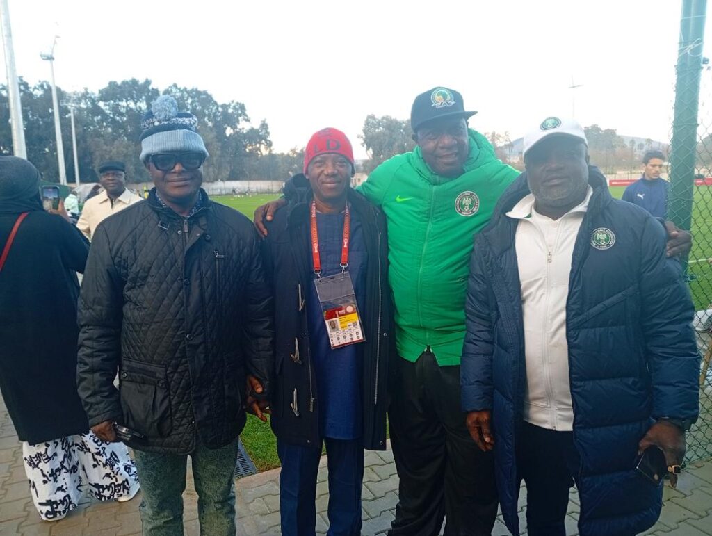 L-R: NFF Communications Director, Dr. Ademola Olajire; yours truly; ProSports News publisher Bayour Issa; and Kwara State FA boss at the Super Eagles final training ahead of the Ugandan game.